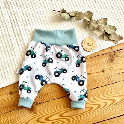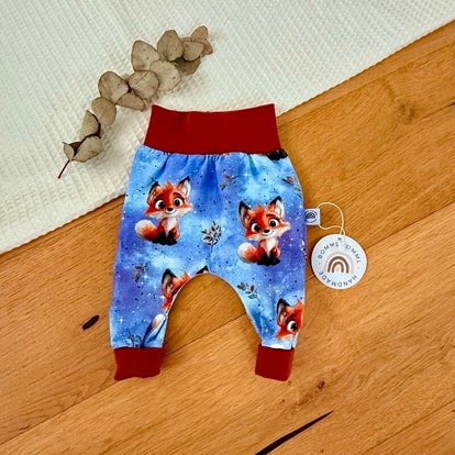 Sie besteht aus weichem Jersey. Der lockere Schnitt ist perfekt für Babys und natürlich zum Toben und Spielen. Die Bauch und Beinbündchen können umgeschlagen werden und somit ist sie eine Mitwachshose.